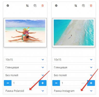 Для этого, в модуле печати укажите в селекте выбора поля рамку Polaroid или рамку Instagram